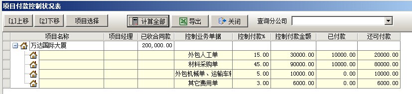 2. 假設(shè)【萬達(dá)國(guó)際大廈】項(xiàng)目,承包合同中累計(jì)收款金額為20萬,那么按控制比例得出的結(jié)果是:人工費(fèi)=200000*15%=30000、材料費(fèi)=2000000*45%=90000、外包機(jī)械運(yùn)輸車輛=10000、其他費(fèi)=6000,具體資金狀況我們可以在菜單二次開發(fā)中打開【項(xiàng)目資金控制狀況表】查看,其中包含了項(xiàng)目控制付款金額(根據(jù)上面的公式得出),已付款金額(根據(jù)累計(jì)付款單得出),還可付款(根據(jù)上面兩組數(shù)據(jù)得出)。