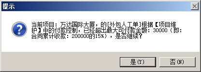 3. 超控制金額付款預(yù)警提示。在新建、審核付款申請(qǐng)單操作時(shí),如果付款申請(qǐng)金額超過還可付款金額,都會(huì)彈出相應(yīng)提示。我們以外包人工單為例,上圖所示還可付款金額為20000,我們做一張付款申請(qǐng)單,如果我們付款金額為30000,那么在單據(jù)保存和單據(jù)審核時(shí),都會(huì)彈出以下的提示: