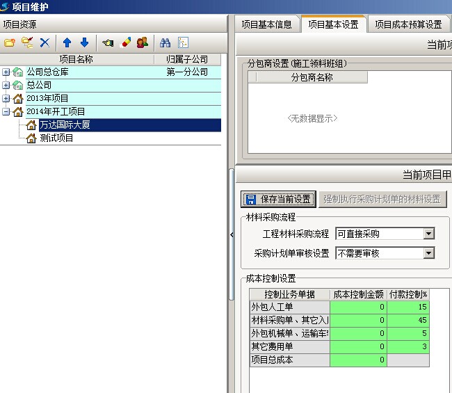 1. 以項(xiàng)目【萬達(dá)國(guó)際大廈】為例,首先要給項(xiàng)目設(shè)定一個(gè)控制比例,在工程管理模塊【項(xiàng)目維護(hù)】中,選擇好項(xiàng)目之后,在項(xiàng)目基本設(shè)置中設(shè)置控制比例,這里的控制比例與前面的成本控制金額無關(guān),是人工、材料、機(jī)械、其他費(fèi)在付款時(shí)所占項(xiàng)目收款的控制比例。如下圖:紅框所畫位置為付款控制比例人工費(fèi)占15%、材料費(fèi)占45%、外包機(jī)械和車輛運(yùn)輸占5%、其他費(fèi)3%