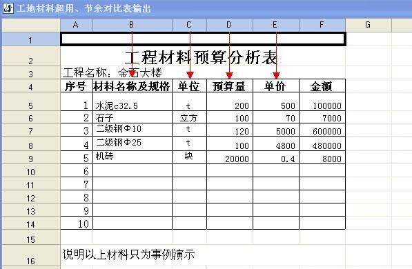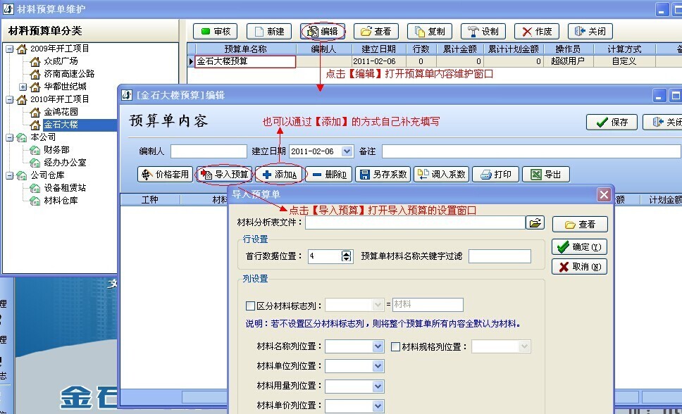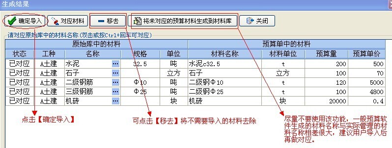 注:以上只是演示了導入預算的全過程,在實踐當中還是建議用戶只將大材料用手工【添加】的方式建立預算單,因為零星的材料名稱多而且繁雜,如果也要將零星材料從預算中導入、再做一一對應,這樣勢必給用戶帶來很大的工作量。況且零星材料也不好準確估算出實際用量。