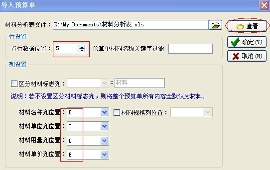 3. 在材料預算單導入設置窗口中設置導入?yún)?shù)如下: