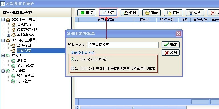 1. 打開【材料管理】模塊中【材料預算單】,選中項目后點擊【新建】按鈕創(chuàng)建材料預算單。