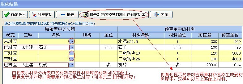 導入完的生成結果,(由于預算軟件中生成的材料分析表里的材料名稱與實際發(fā)生的材料名稱有些差異,這里需要用戶將未對應的材料做下手工匹配)