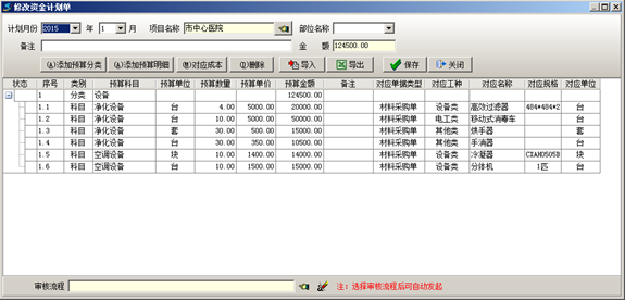 例如下圖所示:預(yù)算分類為設(shè)備,明細(xì)科目為凈化設(shè)備,對(duì)應(yīng)的名稱可以為高效過(guò)濾器、移動(dòng)式消毒車、烘手器等。