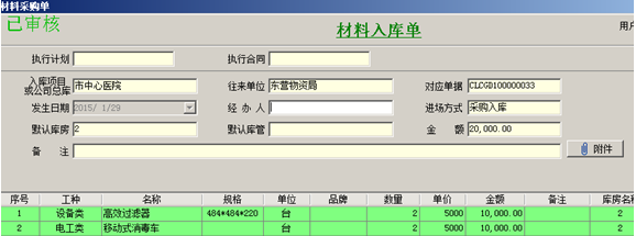 以上面的借款為例,我們來(lái)做一張付款申請(qǐng)單,首先是做業(yè)務(wù)單據(jù),采購(gòu)相應(yīng)設(shè)備(這里設(shè)備不是公司的固定資產(chǎn),而是需要給客戶安裝的設(shè)備,所以是歸到材料類中)應(yīng)該做采購(gòu)入庫(kù)單(材料采購(gòu)單)。