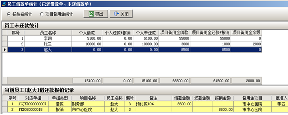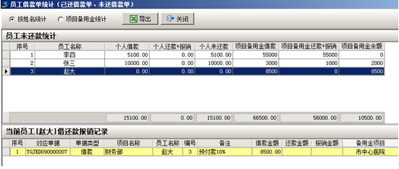請(qǐng)款審核完成后,接下來(lái)是財(cái)務(wù)人員把錢支付給請(qǐng)款人然后執(zhí)行【員工請(qǐng)款單】生成【員工借款單】。下圖所示:生成【員工借款單】后在員工借款單統(tǒng)計(jì)中可以看到,目前借款人趙大,項(xiàng)目備用金借款為8500元。