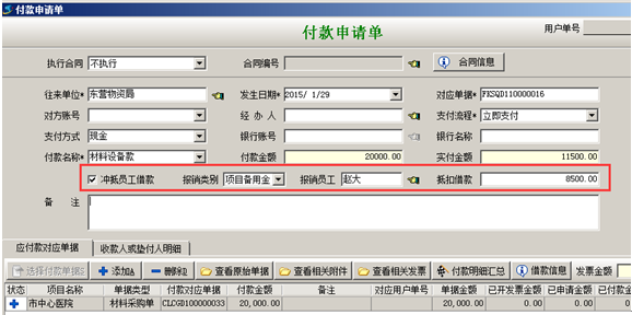 請(qǐng)款人去辦理相關(guān)業(yè)務(wù)之后(如:采購(gòu)相應(yīng)設(shè)備、支付相關(guān)運(yùn)費(fèi)等),是針對(duì)借款做報(bào)銷,首要根據(jù)業(yè)務(wù)類型,創(chuàng)建好相關(guān)業(yè)務(wù)單據(jù)(采購(gòu)設(shè)備是先做采購(gòu)入庫(kù)單),然后根據(jù)業(yè)務(wù)單據(jù)發(fā)起付款申請(qǐng)生成【付款申請(qǐng)單】,填寫【付款申請(qǐng)單】時(shí)要選擇沖抵員工借款,把之前的借款沖抵掉,這樣在員工借款單統(tǒng)計(jì)表中,報(bào)銷欄就會(huì)有相應(yīng)的累計(jì)。