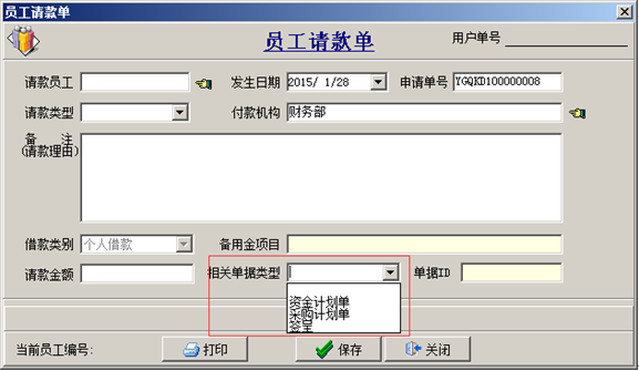 這時(shí)的【員工請(qǐng)款單】較為簡(jiǎn)單,只提供了備注、與附件功能,給審核該單據(jù)的管理人員造成了一定的難度。為了解決這一問題軟件改進(jìn)了【員工請(qǐng)款單】給請(qǐng)款單中增加了三個(gè)來(lái)源:【資金計(jì)劃單】、【采購(gòu)計(jì)劃單】、【簽呈】,以方便在員工請(qǐng)款審核中,查看請(qǐng)款理由是否合理。其中【采購(gòu)計(jì)劃單】和【簽呈】是軟件中一直存在的模塊,直接關(guān)聯(lián)的計(jì)劃單號(hào)和簽呈單ID。