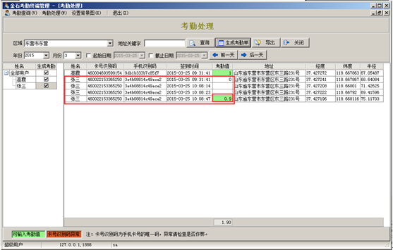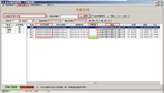 輸入“區(qū)域名稱”或者“關鍵字”,點擊“查詢”按鈕可查詢考勤信息,“卡號識別碼”是手機卡號的唯一識別碼,當“卡號識別碼”顯示異常時可檢查是否存在作弊行為,系統(tǒng)自動定位用戶的簽到地址,若簽到信息正??筛鶕?jù)簽到時間在“考勤值”輸入框中輸入對應的考勤值(若同一用戶一天內(nèi)多次考勤只在最后一次輸入考勤值),如圖: