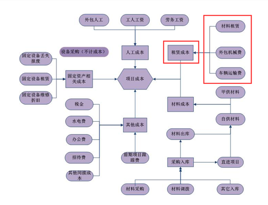 租賃成本,如圖所示:主要分為外包機(jī)械成本、運(yùn)輸車輛成本和租賃材料成本。