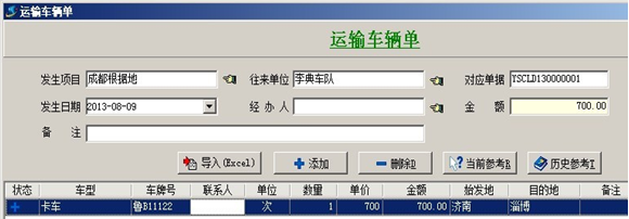 2. 【運(yùn)輸車輛成本】一般用于統(tǒng)計(jì)公司租賃車輛周轉(zhuǎn)材料所產(chǎn)生的成本,成本根據(jù)運(yùn)輸車輛單來統(tǒng)計(jì)。