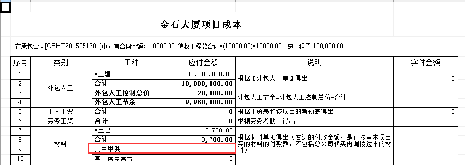 當(dāng)不勾選上甲供材計(jì)入工程成本時(shí),甲供材這顯示為0。如下圖: