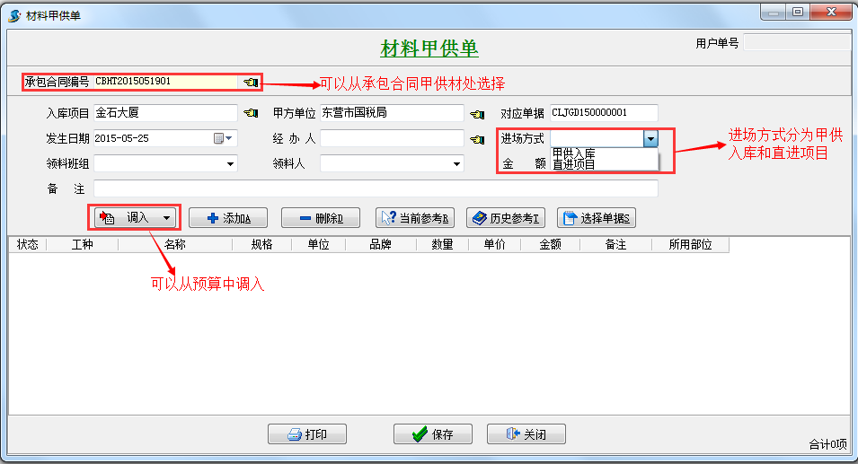 點(diǎn)擊主菜單【材料】->【材料甲供單】->【新建】打開 新建【材料甲供單】窗口 界面如下: