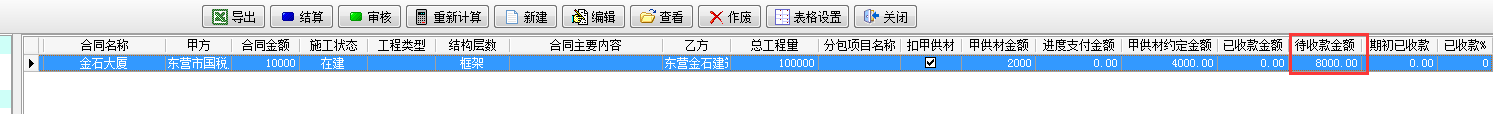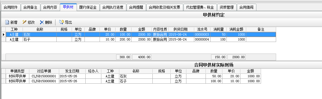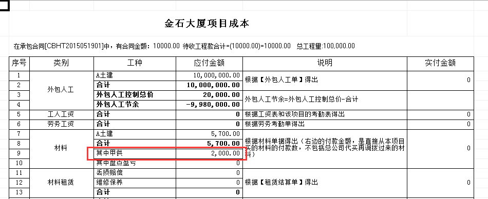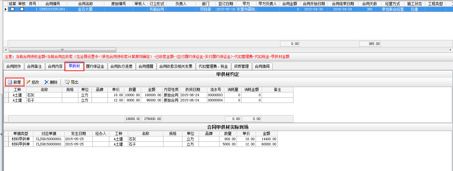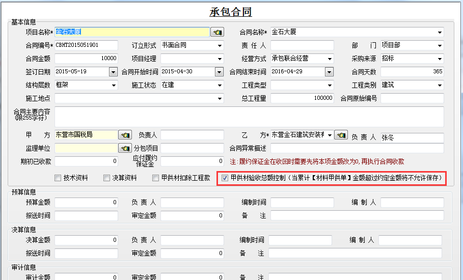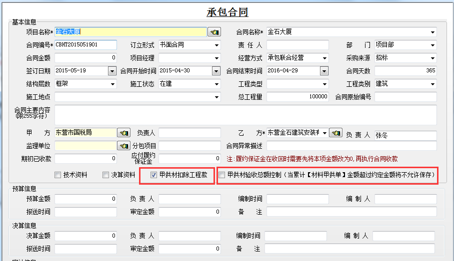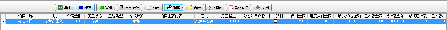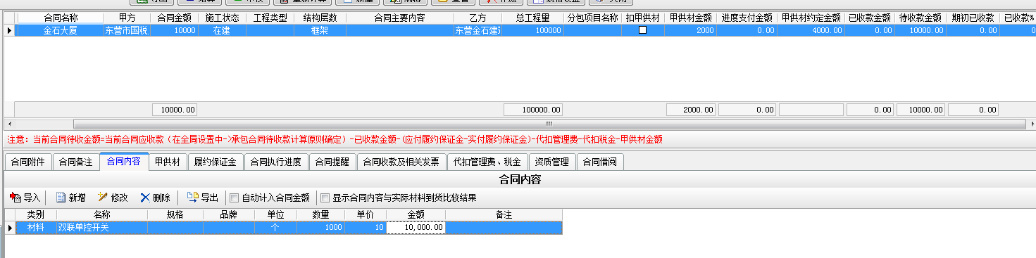 例如我們做一個(gè)合同金額為10000的承包合同,其中在工程甲供材料管理中甲供材約定金額為4000。如下圖