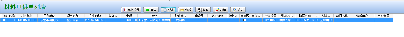 點(diǎn)擊【保存】返回到【材料甲供單列表】界面下,如下圖: