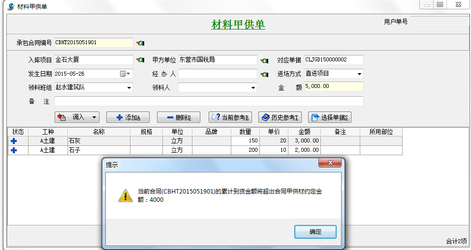 勾選好之后當(dāng)累計(jì)材料甲供單金額超過(guò)甲供材料約定金額時(shí),則不能保存。如下圖: