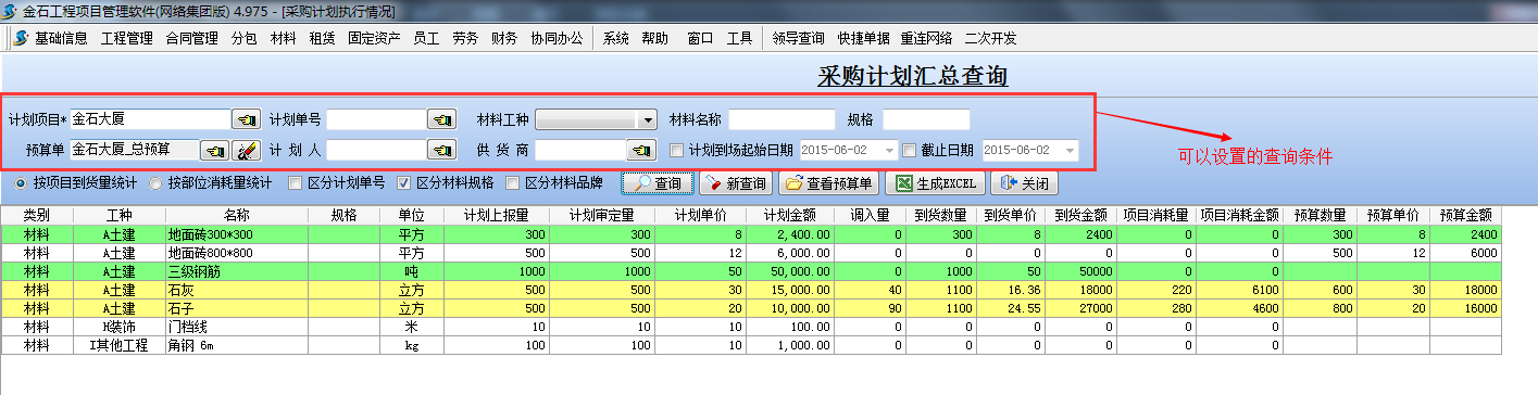 在工程項目管理系統(tǒng)中【采購計劃執(zhí)行匯總】 可以設置多重條件來匯總所有的【采購計劃單】的執(zhí)行情況,如下圖:
