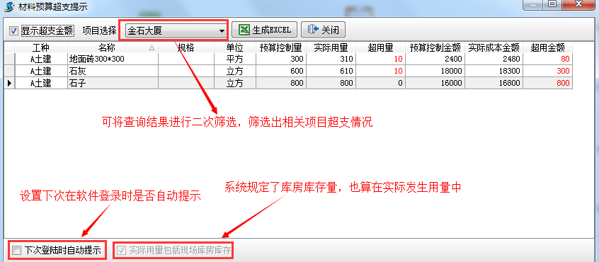 在工程項目管理系統(tǒng)中【材料超支預算提示】用來查詢所有項目的材料超支情況,包括量的超支和價的超支。如下圖: