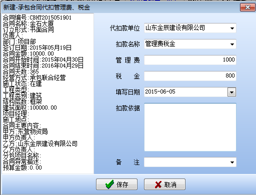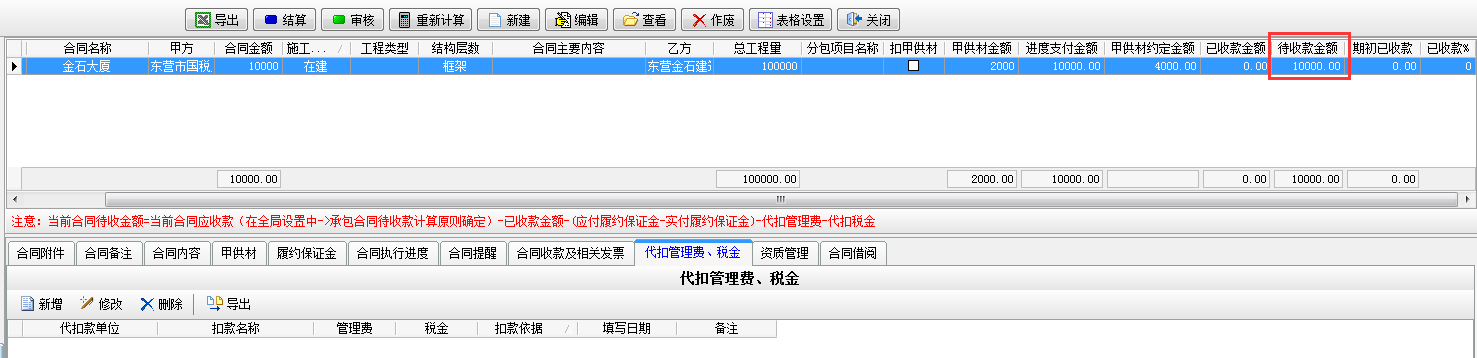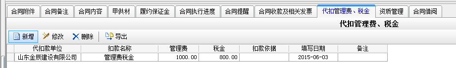 在工程項目資質掛靠管理中因為借用乙方B的資質,需要扣除管理費,如果需要乙方B代開發(fā)票還需要扣除稅金。在承包合同中[代扣管理費稅金]模塊下操作,如下圖: