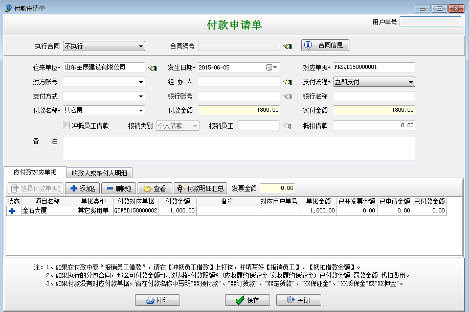 在工程項目資質掛靠管理中因為借用乙方B的資質或者乙方B代開發(fā)票需要向乙方B支付管理費和稅金。這時我們需要做其他費用單在做付款申請單或者付款單,具體操作如下: