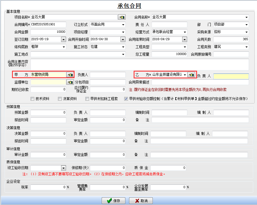 我公司借其他公司資質主要涉及到的模塊為【承包合同】,錄入相關單據(jù)前,需先錄入要用到的基礎信息中的【項目維護】,【工程類型維護】,【往來單位維護】,【子公司信息維護】