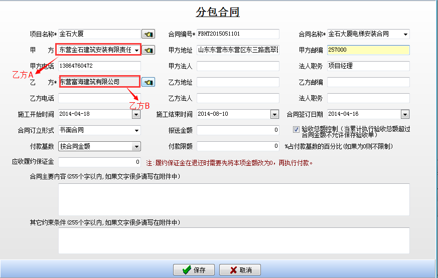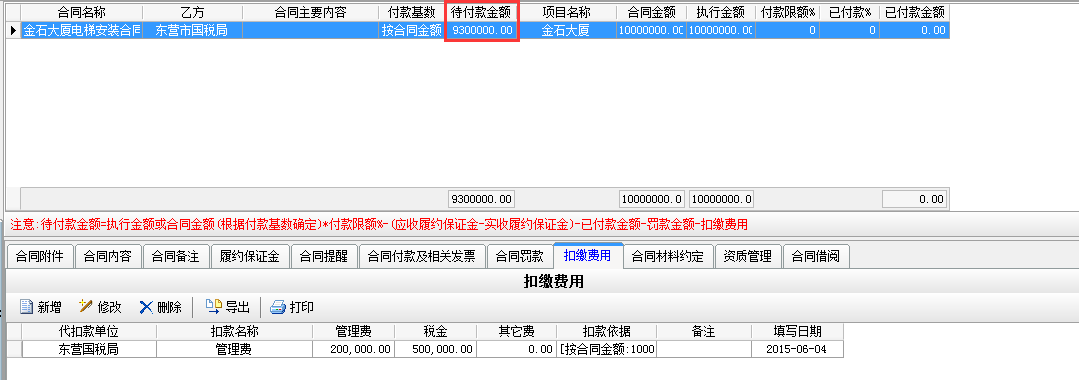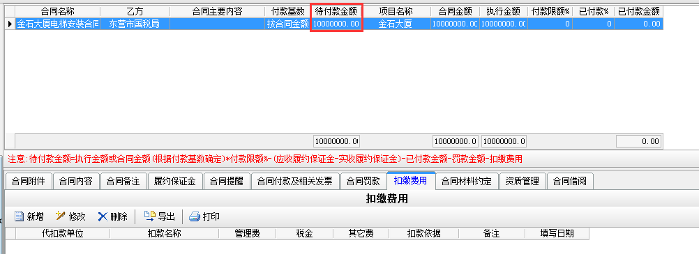 在工程項目資質掛靠管理中乙方B借用乙方A的資質,乙方A需要扣除乙方B管理費,如果需要乙方A代開發(fā)票還需要扣除稅金。在分包合同中[扣繳費用]模塊下操作,如下圖: