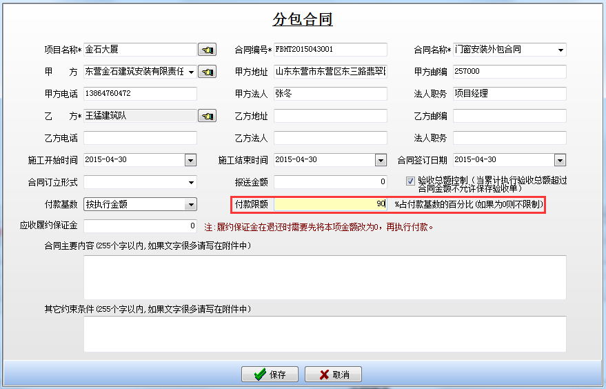 備注:付款控制比例是以當(dāng)前項目所對應(yīng)的承包合同實際收款數(shù)為基數(shù)。當(dāng)前最大可付金額即承包合同實際收款數(shù)乘以付款控制比例。