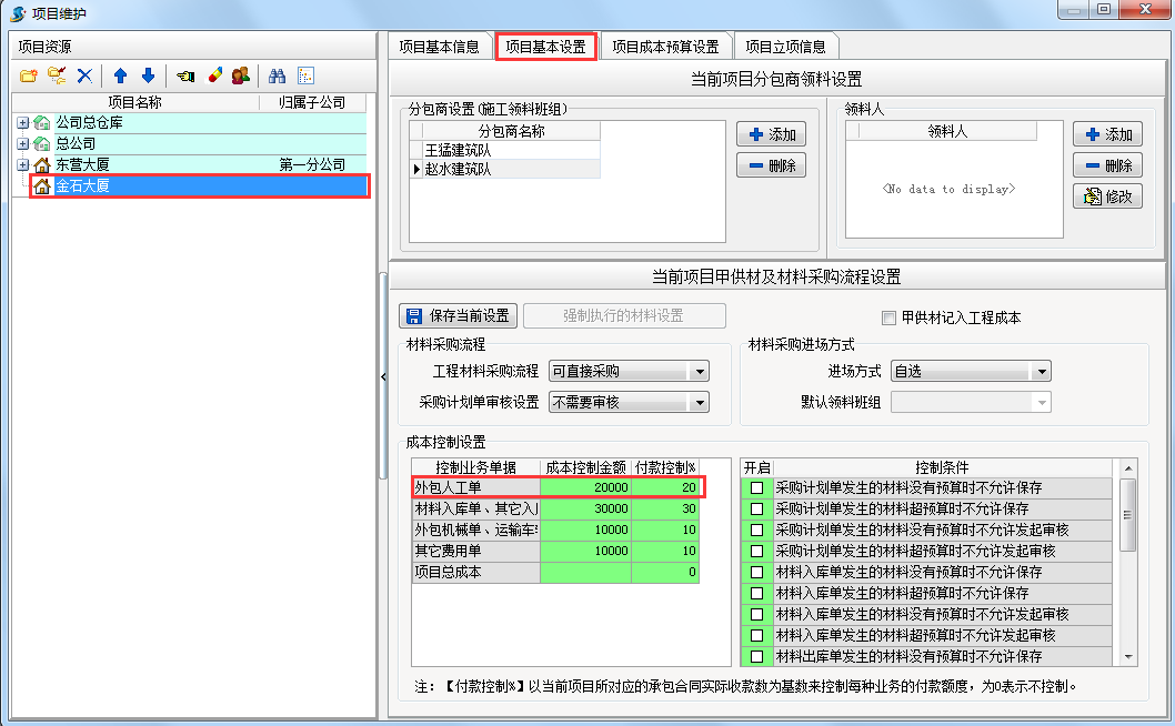 在新建項目時設(shè)置成本控制金額和付款控制比例。具體設(shè)置方法【工程管理】模塊?【項目維護】項目