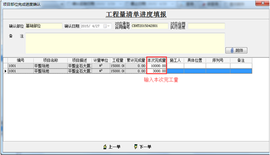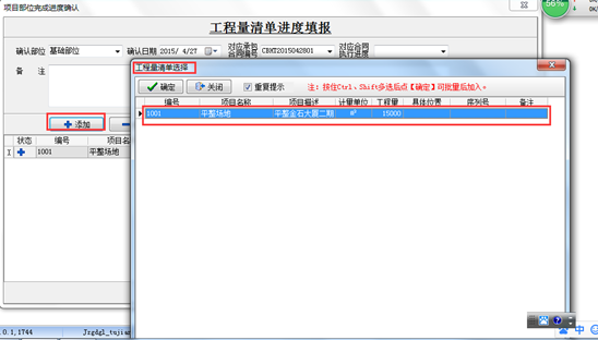 然后點(diǎn)“添加”按鈕,在彈出的“工程量清單選”窗口中選擇需要填報的清單內(nèi)容,然后在本次完成量處輸入已完成的工作量,如圖: