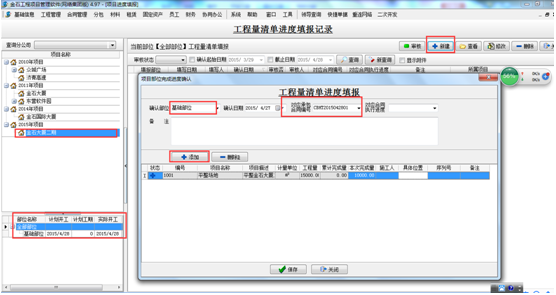 如下圖所示,在彈出的“項(xiàng)目部位分解及工程量清單設(shè)置”窗口中點(diǎn)“添加”按鈕,然后依次填寫項(xiàng)目部位名稱、工程量、單位等相關(guān)信息,