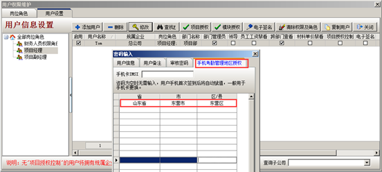 如果用戶有手機(jī)考勤管理地區(qū)授權(quán),則點(diǎn)擊“手機(jī)考勤管理地區(qū)授權(quán)”,輸入被授權(quán)的地址,則用戶會有權(quán)限查看被授權(quán)地區(qū)的員工考勤信息。