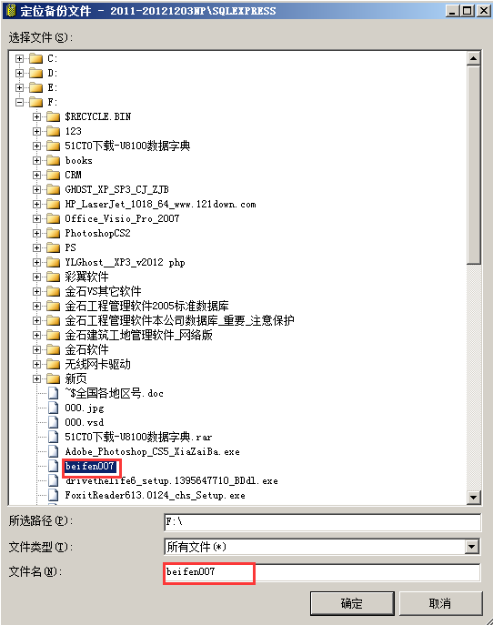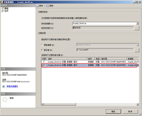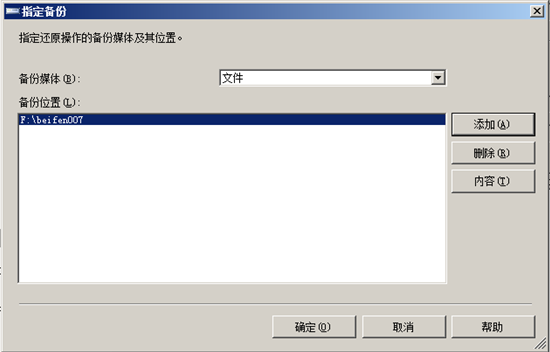 進(jìn)入“指定備份對(duì)話框”,點(diǎn)擊“添加”,進(jìn)入指定數(shù)據(jù)庫文件窗口,瀏覽并找到需要還原的數(shù)據(jù)庫備份文件,點(diǎn)擊“確定”, 點(diǎn)擊“確定”后回到指“定備份”對(duì)話框,此時(shí)需要還原的文件已經(jīng)列出來了,接著點(diǎn)擊“確定”,返回“還原數(shù)據(jù)庫”。如圖: