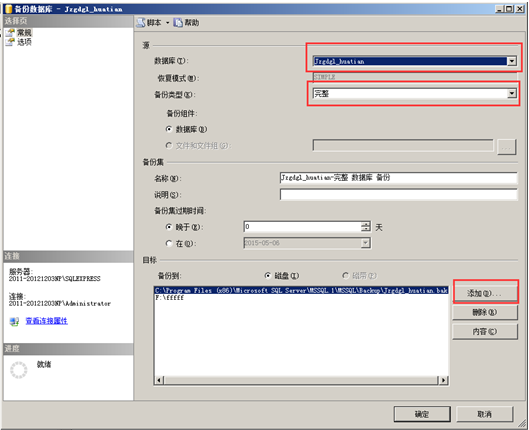 在“對(duì)象資源管理器”找到想要進(jìn)行備份的數(shù)據(jù),選中點(diǎn)擊鼠標(biāo)右鍵,點(diǎn)擊“任務(wù)”-“備份”,彈出“備份數(shù)據(jù)庫”的對(duì)話框,備份類型選擇“完整”,“目標(biāo)”是備份文件的位置,可以自定義一個(gè)比較好找的目標(biāo),這樣備份以后就可以方便的找到備份文件了,設(shè)置完成點(diǎn)“確定”即可,然后到目標(biāo)目錄下找到備份文件就是所需的備份文件,如圖: