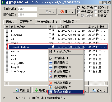 Sql2000數(shù)據(jù)備份時(shí),在電腦的右下角點(diǎn)擊迷你sql的圖標(biāo)彈出迷你SQL2000的對(duì)話框,選中要備份的數(shù)據(jù)庫名稱。點(diǎn)擊鼠標(biāo)右鍵選在“備份數(shù)據(jù)庫”,彈出“另存為”的對(duì)話框,選擇備份文件保存的地址,輸入備份文件的名字,然后點(diǎn)擊“保存”的按鈕,如圖: