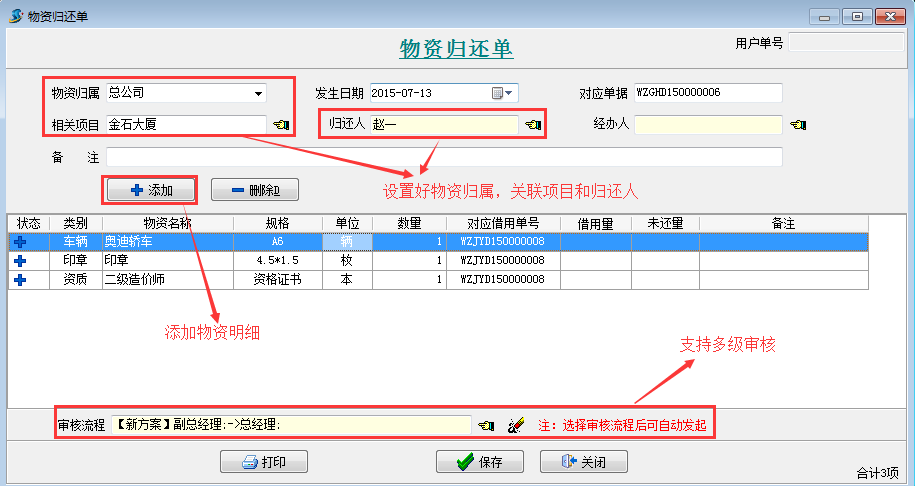 【物資歸還單】是用來統(tǒng)計(jì)借用人歸還物資的業(yè)務(wù)單據(jù)。