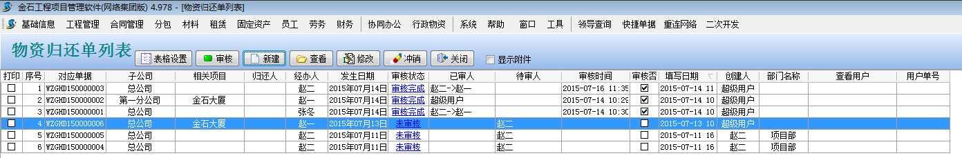工程項(xiàng)目物資管理可用于管理車輛,印章,證書,資質(zhì),設(shè)備,辦公用品等物資的入庫(kù),報(bào)損,借用,歸還等過程。錄入相關(guān)單據(jù)前,需先錄入要用到的基礎(chǔ)信息中的【物資維護(hù)】【子公司信息維護(hù)】。
