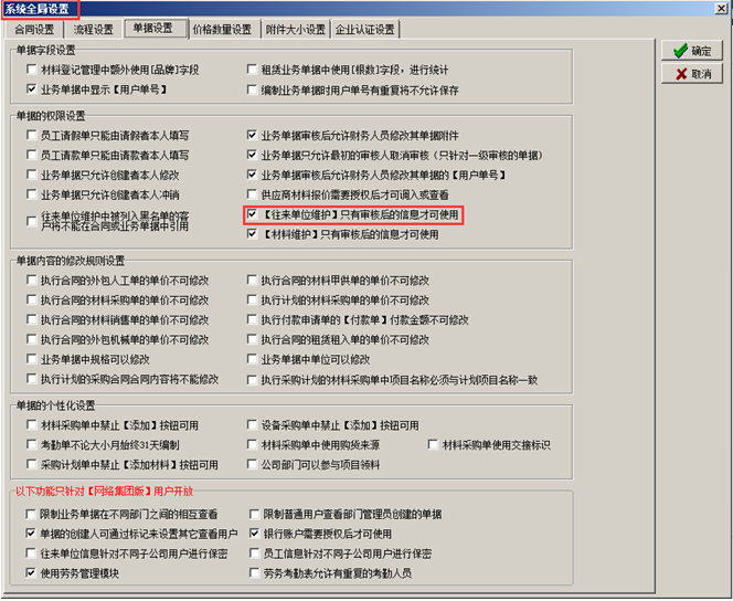 在金石工程管理軟件中可對(duì)添加的“往來單位信息”進(jìn)行審核(此功能為可選功能),使用“材料審核”的功能前,需在“系統(tǒng)維護(hù)”-“系統(tǒng)全局設(shè)置”-“單據(jù)設(shè)置”中將此功能開關(guān)打開。如圖: