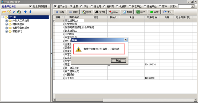 如果工程項(xiàng)目管理軟件中的“往來單位”信息已經(jīng)通過審核,則不可進(jìn)行分類的變更,系統(tǒng)會(huì)給出對(duì)應(yīng)的提示。如圖:
