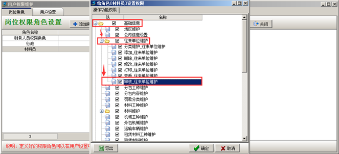 在“系統(tǒng)維護(hù)”-“用戶管理權(quán)限設(shè)置”給具有“往來單位”審核權(quán)限的用戶分配權(quán)限,如圖: