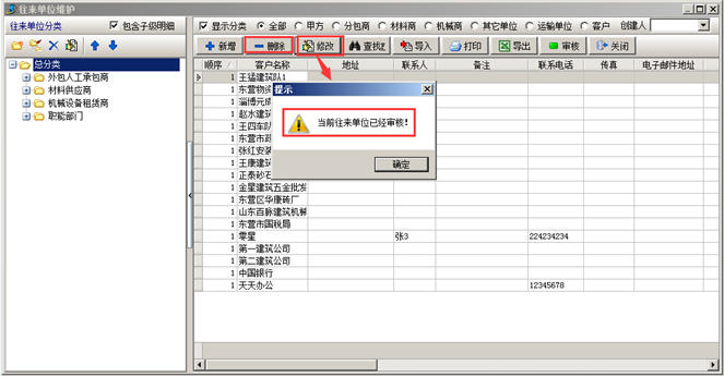 工程項(xiàng)目管理軟件中審核過的“往來單位”信息不允許進(jìn)行“刪除”或“修改”的操作,“刪除”或“修改”時(shí)系統(tǒng)會(huì)給出對(duì)應(yīng)的提示,如圖: