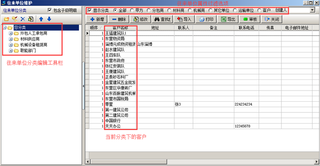 往來單位維護(hù)在金石工程項(xiàng)目管理軟件中是用來登記往來單位信息的,大部分業(yè)務(wù)單據(jù)都會(huì)使用到、這里需要將與本公司所有有賬務(wù)往來的單位都要維護(hù)好。包括分包商、材料商、甲方、機(jī)械租賃商、運(yùn)輸單位、銀行等。如果工程項(xiàng)目管理軟件的系統(tǒng)設(shè)置中開啟了往來單位信息的審核功能則往來單位的信息審核通過之后在系統(tǒng)業(yè)務(wù)單據(jù)中可用。如下圖界面,可以利用供應(yīng)商分類功能的完成歸類。
