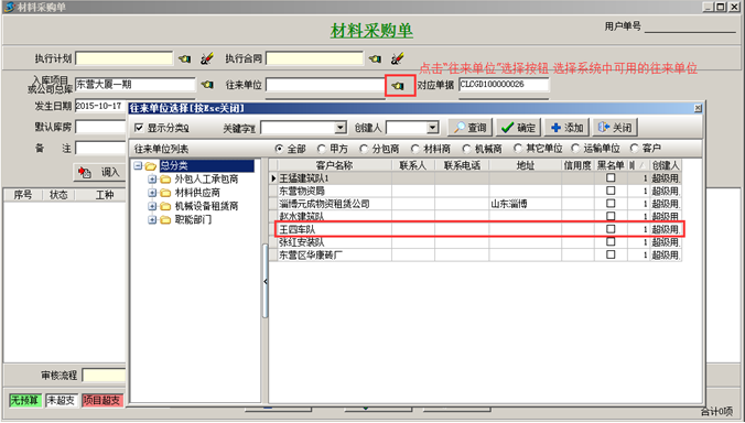 工程項(xiàng)目管理軟件中審核通過的“往來單位”信息可在系統(tǒng)業(yè)務(wù)單據(jù)中可顯示并使用,審核未通過的“往來單位”在系統(tǒng)業(yè)務(wù)單據(jù)中不可用。如圖: