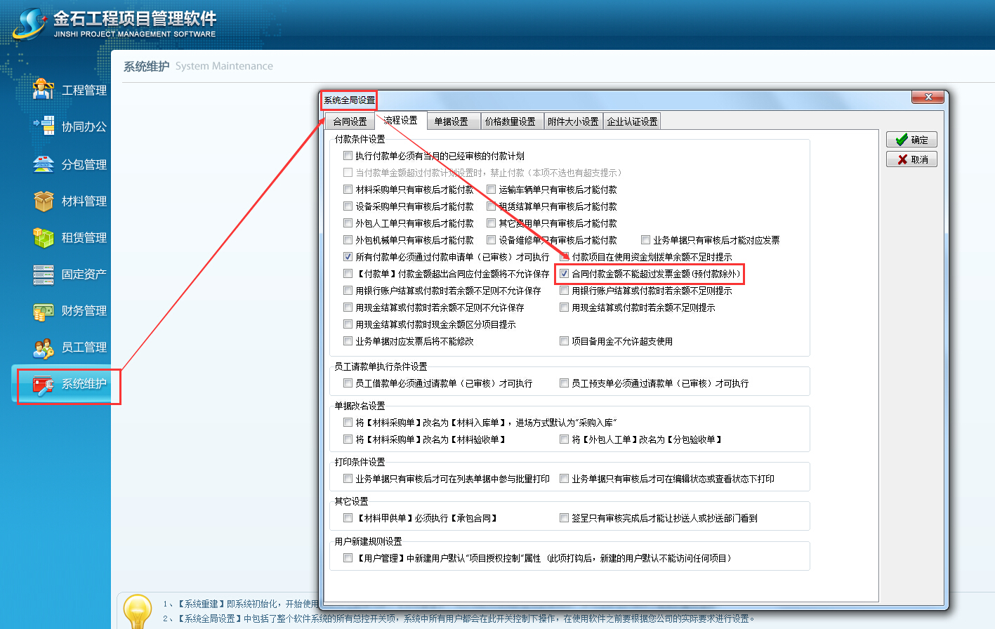 在【系統(tǒng)維護】-【系統(tǒng)全局設(shè)置】可以設(shè)置合同付款金額不能超過發(fā)票金額(預(yù)付款除外),如下圖: