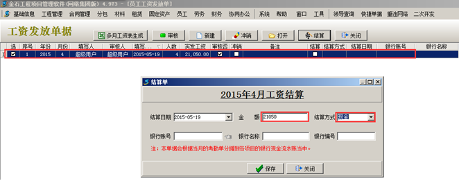 工程管理軟件中結(jié)算時(shí),選中審核通過的“員工工資表”,點(diǎn)擊“結(jié)算”的按鈕,可選擇“分人結(jié)算”或“整單結(jié)算”。