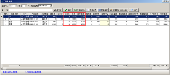 Jim在眾城廣場一期出勤天數(shù)20,合計(jì)工30,預(yù)支借款1100,實(shí)發(fā)工資3295,
