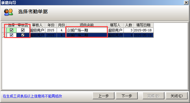 在做員工工資表時(shí),選擇生成四月份工資表,并同時(shí)選擇“眾城廣場一期”和“眾城廣場二期”的考勤單據(jù)。