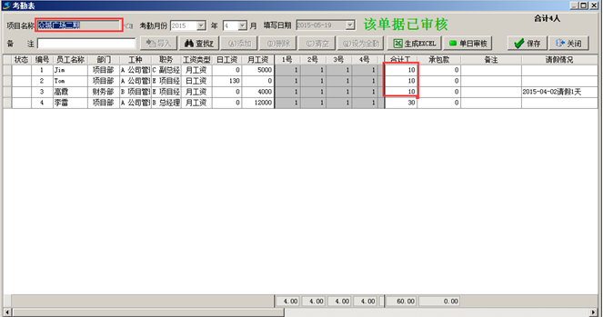 例如,Jim、Tom、高霞都是在同月出勤了兩個(gè)項(xiàng)目“眾城廣場一期”和“眾城廣場二期”,則在工程管理軟件中四月份分別做兩給項(xiàng)目的考勤表。如圖: