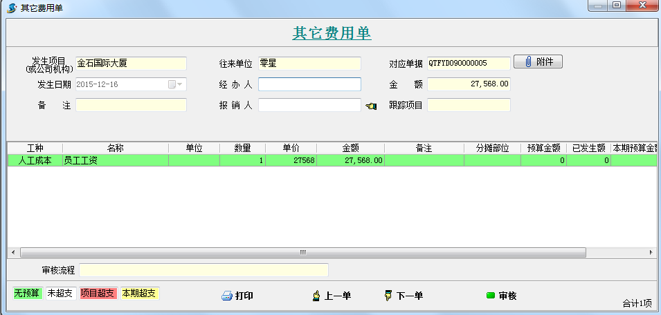 使用工程管理軟件【財務(wù)管理】-【其他費(fèi)用單】記錄員工工資合計,詳細(xì)的excel工資表可導(dǎo)入到其他費(fèi)用單單據(jù)附件中。如下圖: