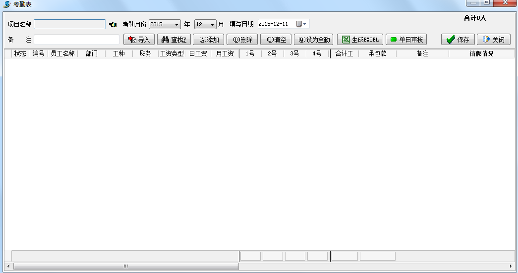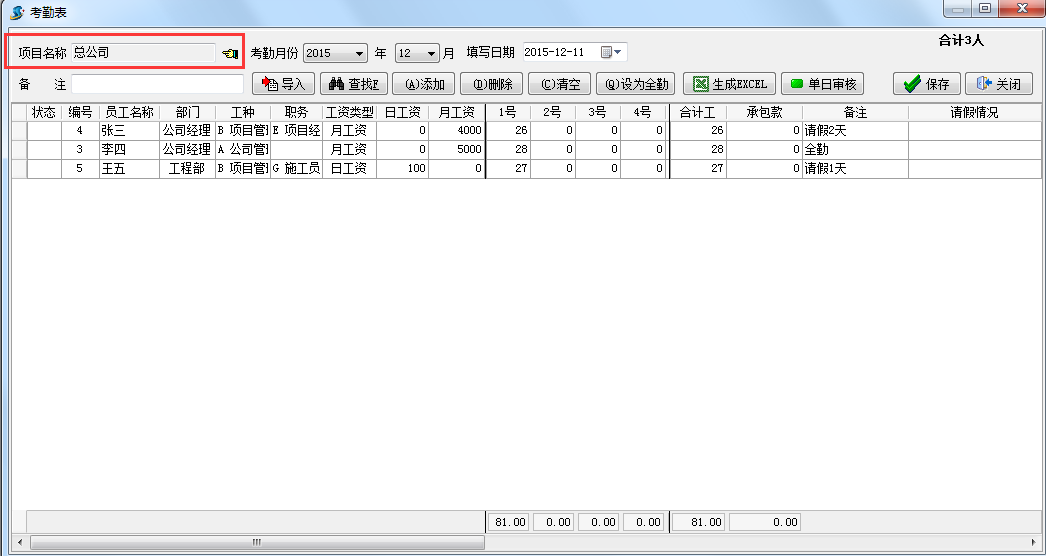 在工程管理軟件只記錄每人每月的合計工考勤,考勤單不區(qū)分項(xiàng)目,合計工填寫在考勤表的任意一天即可。