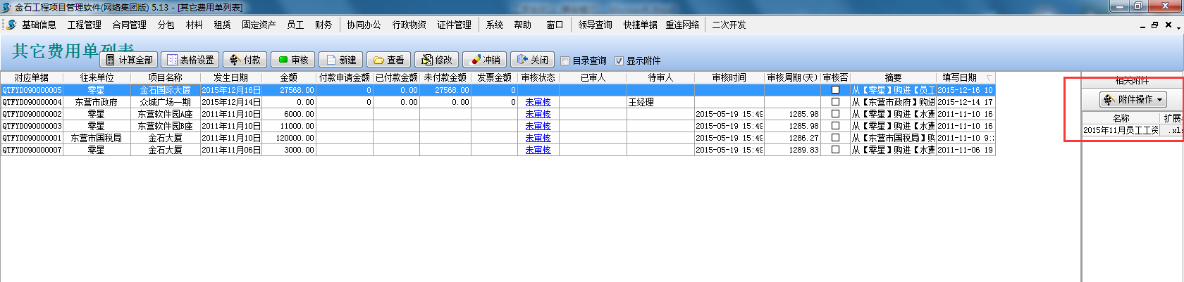 在工程管理軟件將所有人員實(shí)發(fā)工資做為一個總數(shù)錄入到【其它費(fèi)用單】中,也可一個項(xiàng)目錄入一個【其它費(fèi)用單】。工資單的可以通過Excel附件掛到其它費(fèi)用單下。本方法適合企業(yè)已有相關(guān)的財務(wù)軟件或Excel來處理工資表,又不想在金石中花費(fèi)精力詳細(xì)錄入。